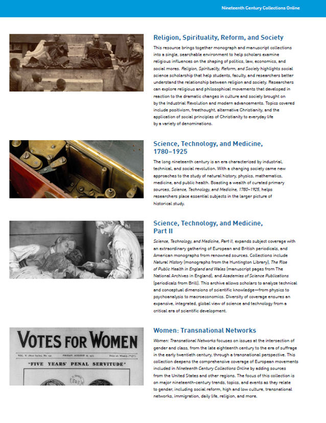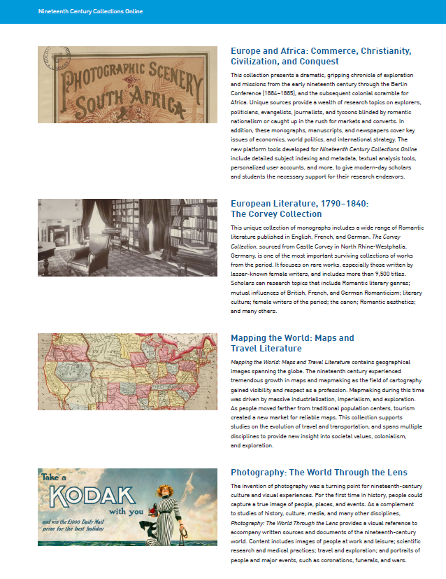 Gale’s Nineteenth Century Collections Online is the product of partnerships between Gale and almost one hundred libraries in effort to preserve and make content available digitally for academic research. The collection features broad content consisting of monographs, newspapers, pamphlets, manuscripts, ephemera, maps, photographs, statistics, and other kinds of documents in both Western and non-Western languages.