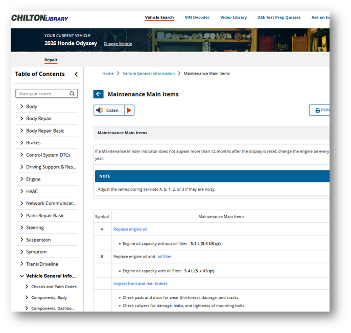 For those looking to perform maintenance on their car or truck, see the following example for the 2026 Honda Odyssey, listing key tasks and specifications, including links to additional information. Get a glimpse of the extensive table of contents in the left panel.