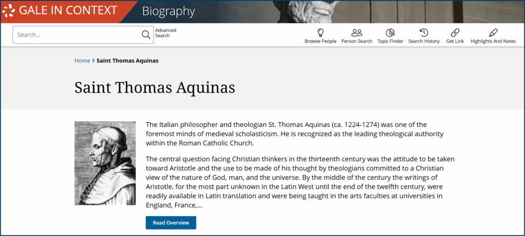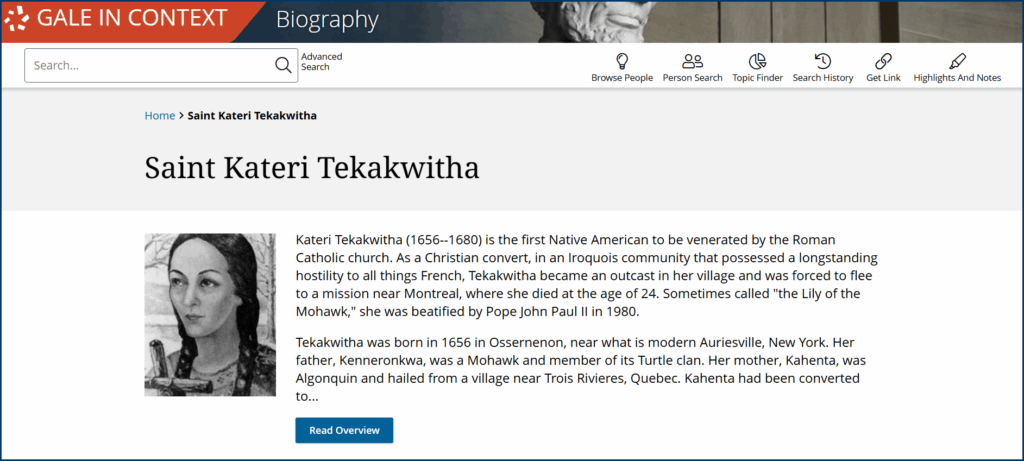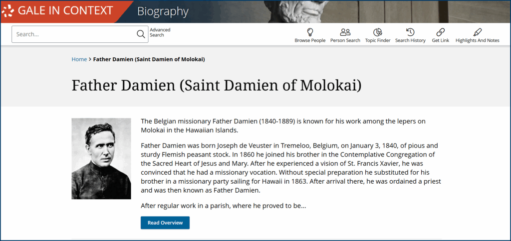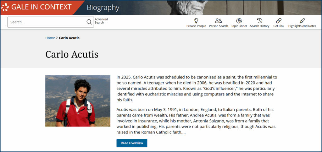 Let’s examine the lives and accomplishments of several figures who achieved sainthood, all of whom have entries available through Gale In Context: Biography.