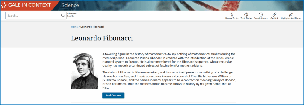 To celebrate the story of this mathematician from Pisa and why his famous sequence still matters today, you will find links throughout to Gale In Context: Science, making it easy for busy teachers to preview and integrate trustworthy materials into their lessons.
