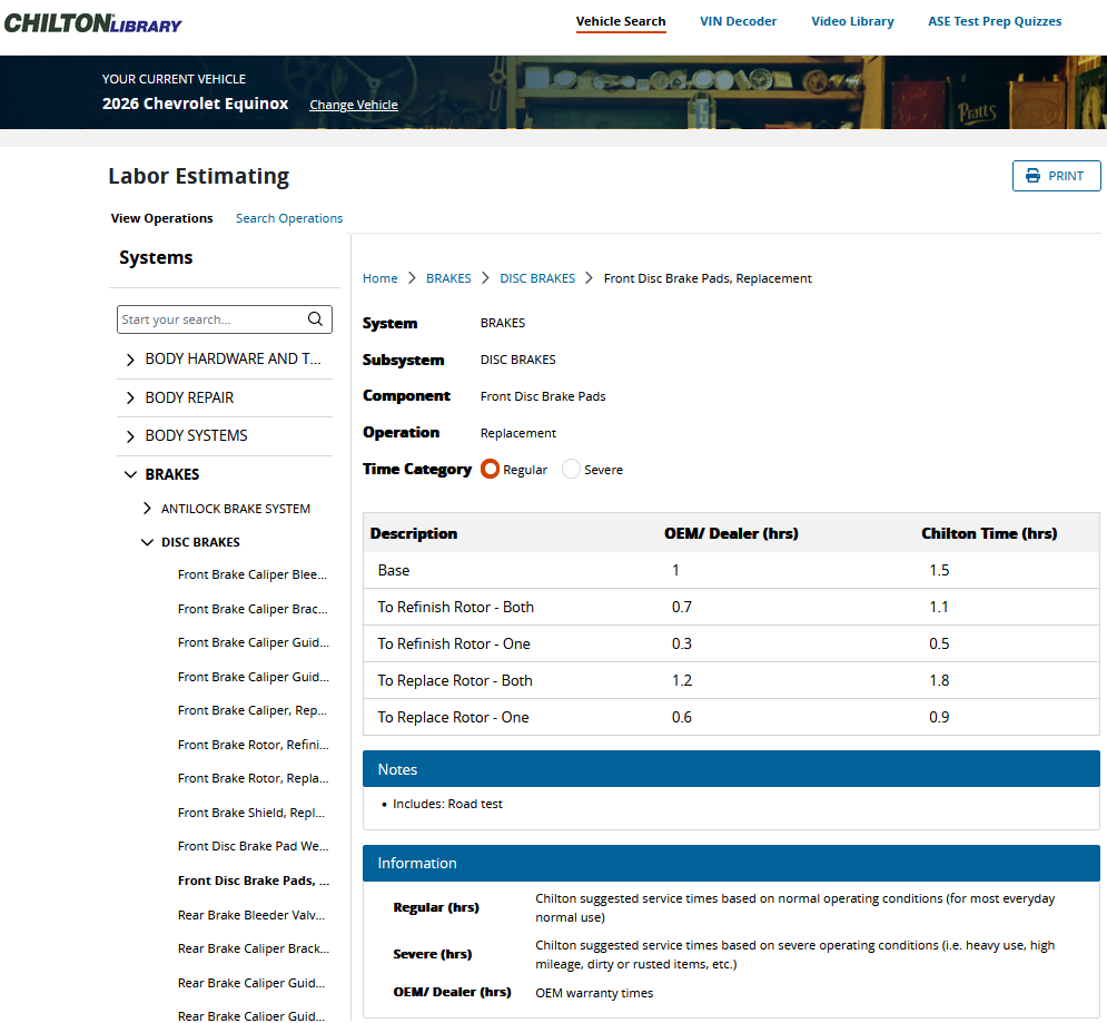 ChiltonLibrary recently updated OEM and Chilton labor estimating times for Buick, Cadillac, Chevrolet, GMC, Ford, and Lincoln models. The screenshot below shows an excerpt from the 2026 Chevrolet Equinox front disc brake pads labor estimating times. Toggle the red “Time Category” button in the app to view the time estimates for severe operating conditions, such as towing, stop-and-go traffic, or high mileage.