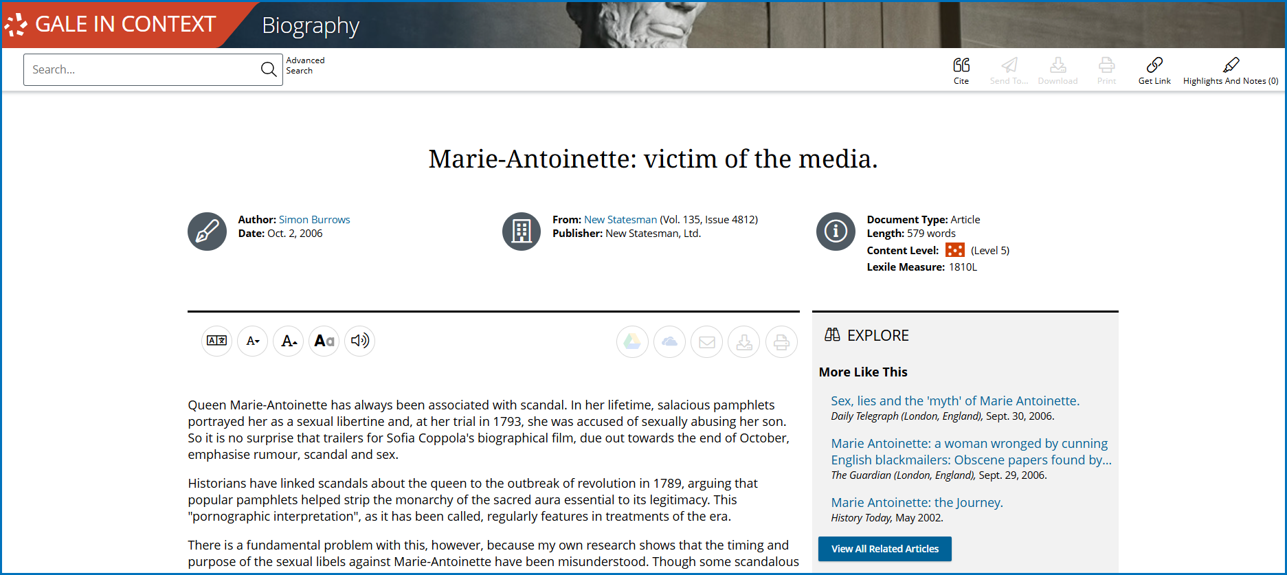 Marie Antoinette’s life provides a rich opportunity for students to comprehend nuanced historical topics from multiple perspectives. With our suite of trustworthy, vetted resources, Gale In Context: Biography can help you enhance student learning in memorable ways.