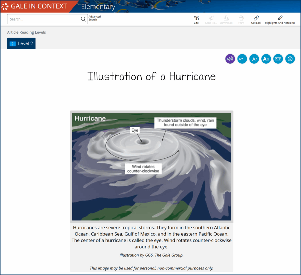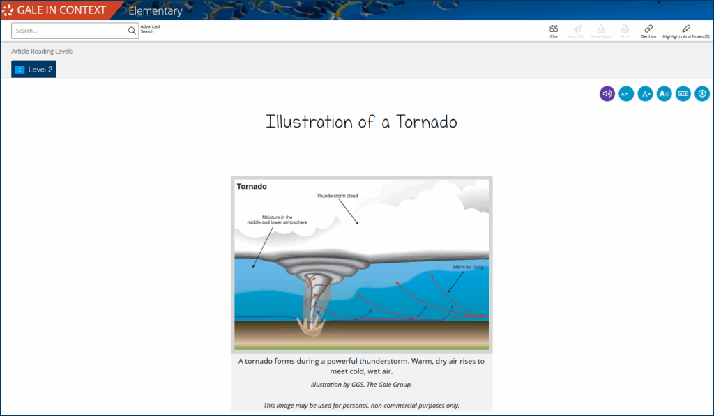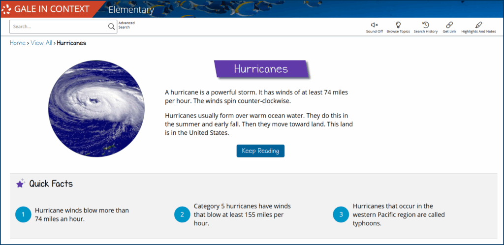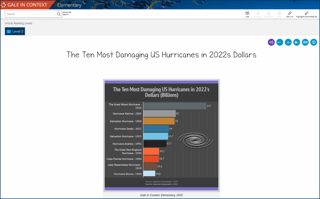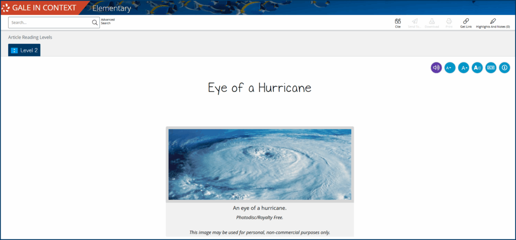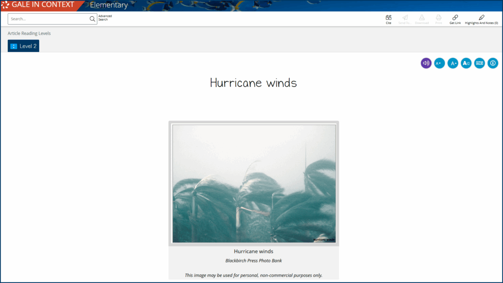 With Gale In Context: Elementary, your class can explore weather topic pages that cover natural phenomena like hurricanes, droughts, floods, and more. Each page offers articles, photographs, videos, and audio clips designed for K-5 learners, while built-in tools like adjustable reading levels, text-to-speech, and translation ensure the material can support everyone in the class, from emerging to confident readers.