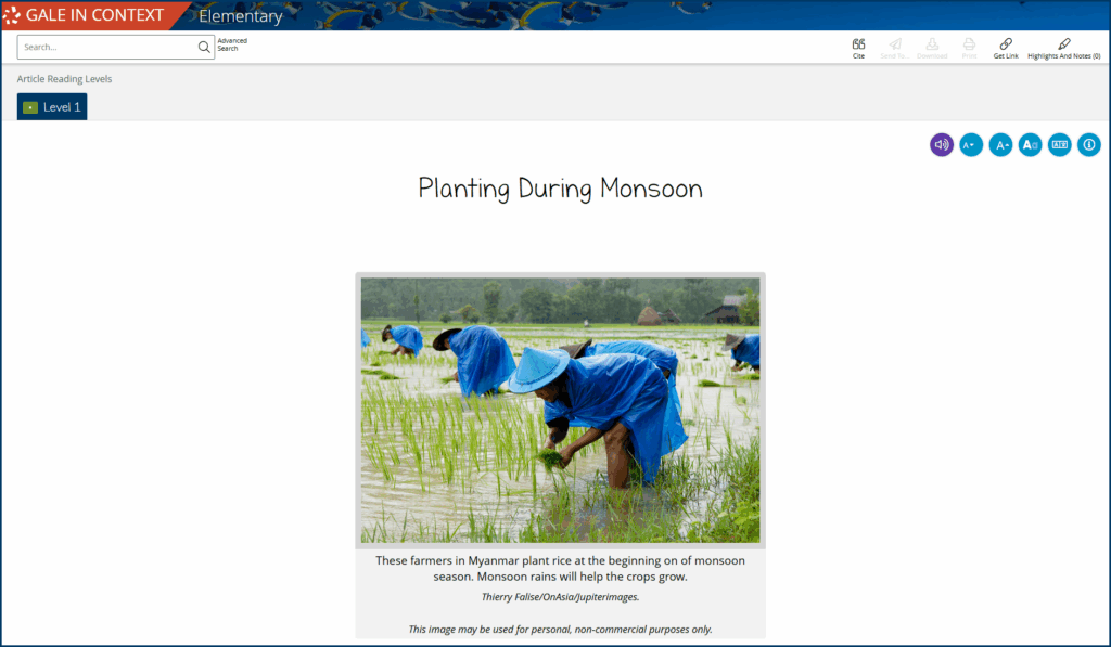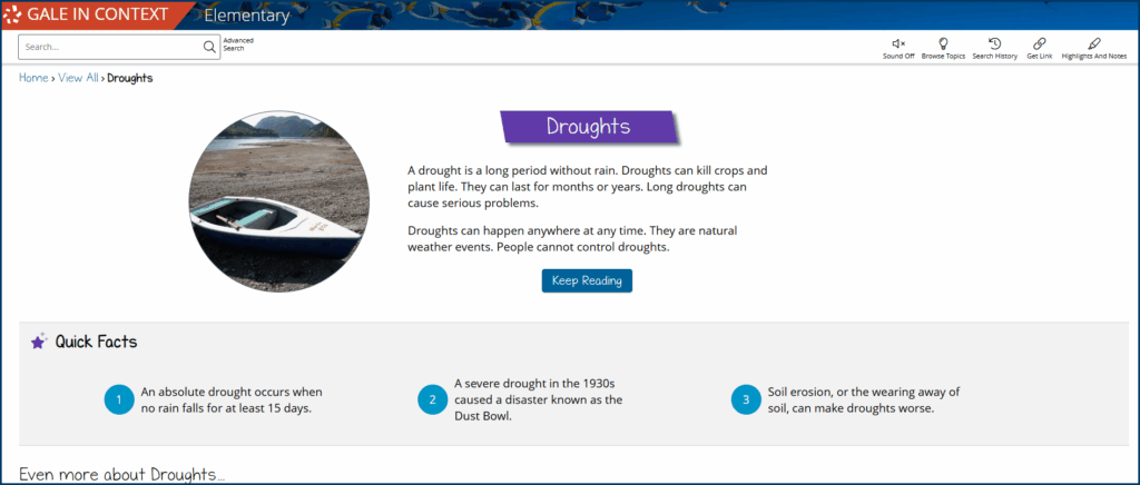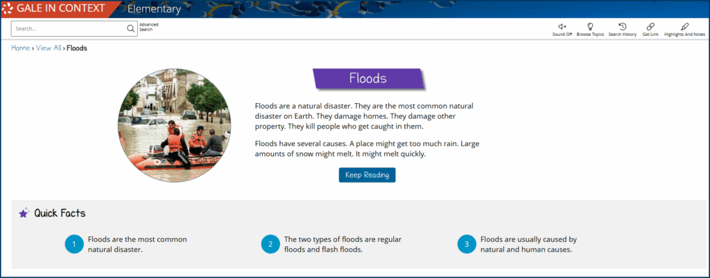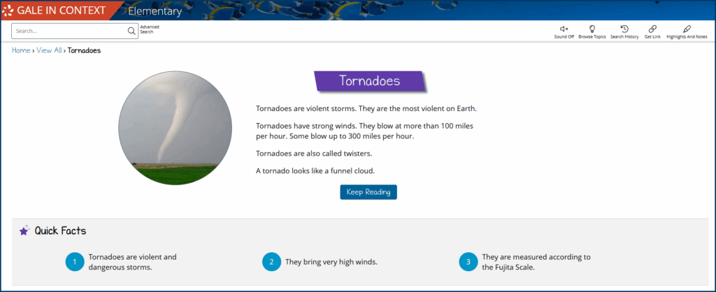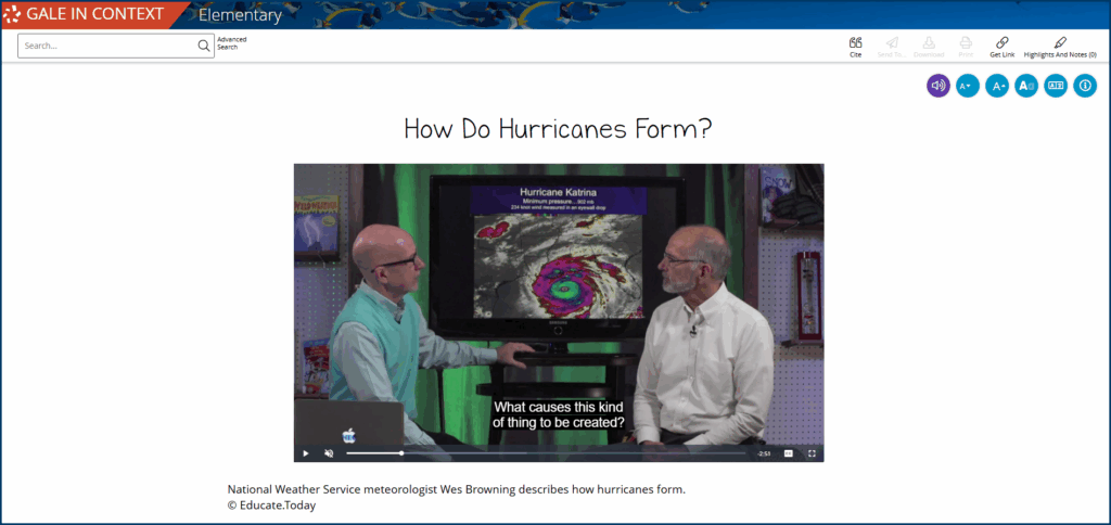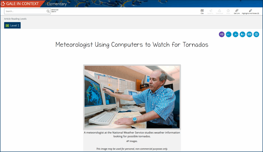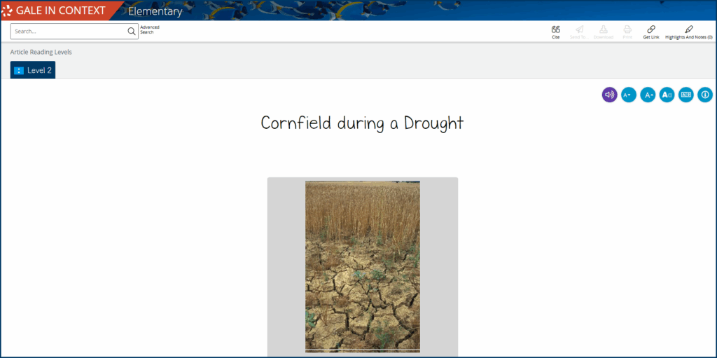 With Gale In Context: Elementary, your class can explore weather topic pages that cover natural phenomena like hurricanes, droughts, floods, and more. Each page offers articles, photographs, videos, and audio clips designed for K-5 learners, while built-in tools like adjustable reading levels, text-to-speech, and translation ensure the material can support everyone in the class, from emerging to confident readers.