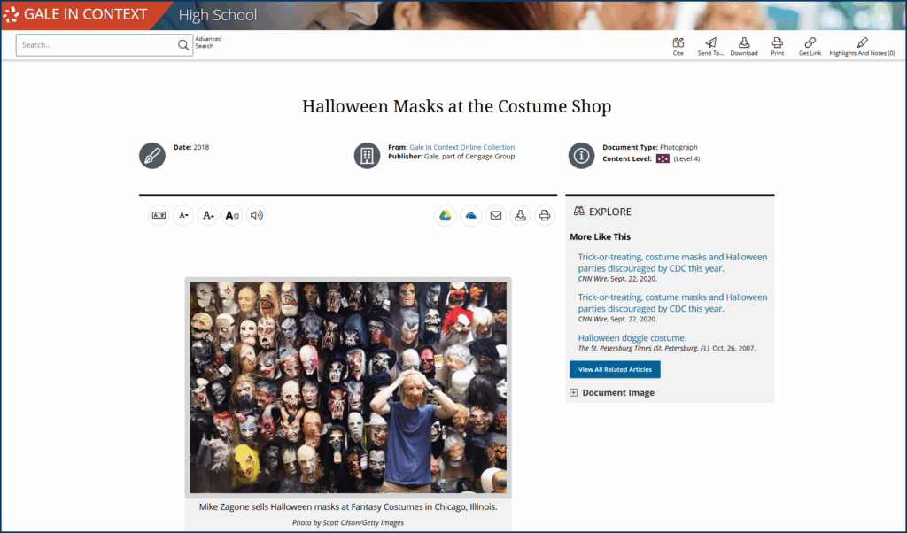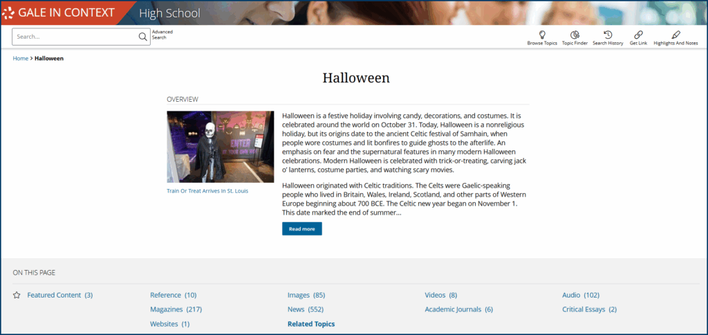 With Gale In Context: High School, students can follow their curiosity into Halloween’s history without teachers having to worry about what they might encounter. The platform brings together credible sources—scholarly articles, primary texts, and historical images—all curated for classroom use. It gives students the freedom to explore complex topics from multiple angles while giving educators confidence that the content is accurate and instructionally sound.
